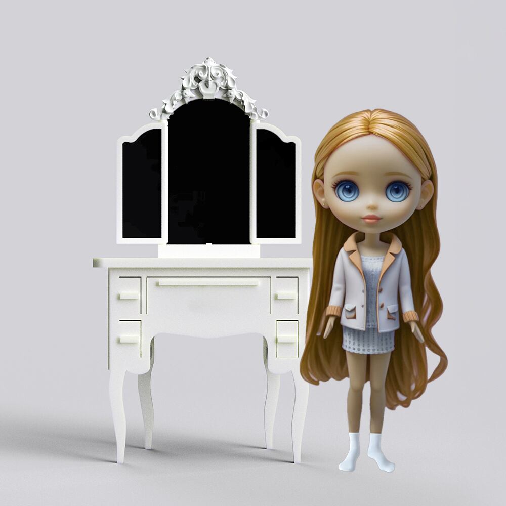 【説明】エレガントなロココ調の彫刻と猫足が魅力の、組み立て式ミニチュア3面鏡ドレッサー。接着剤不要でわずか5分で完成し、ダボ穴が見えない美しい仕上がりです。開閉可能な3面鏡は本物のミラーを使用し、取り外せば机としても活躍。5つの引き出しもついており、小物収納にも便利です。ブライスやリカちゃんにぴったりのサイズ感で、ドールハウスやお部屋のオブジェとしても最適。オリジナリティとセンスのあるギフトとして喜ばれます。