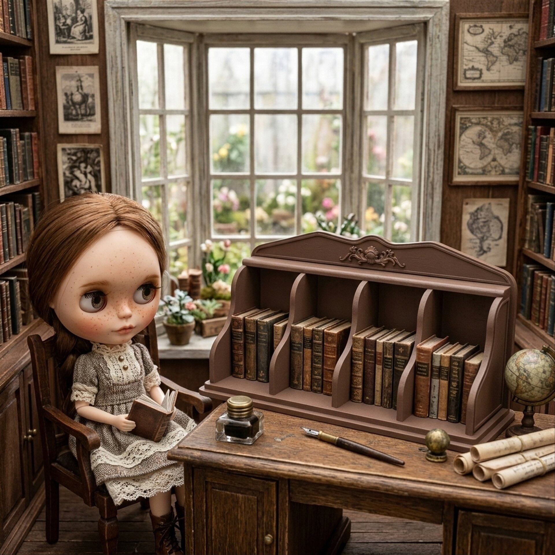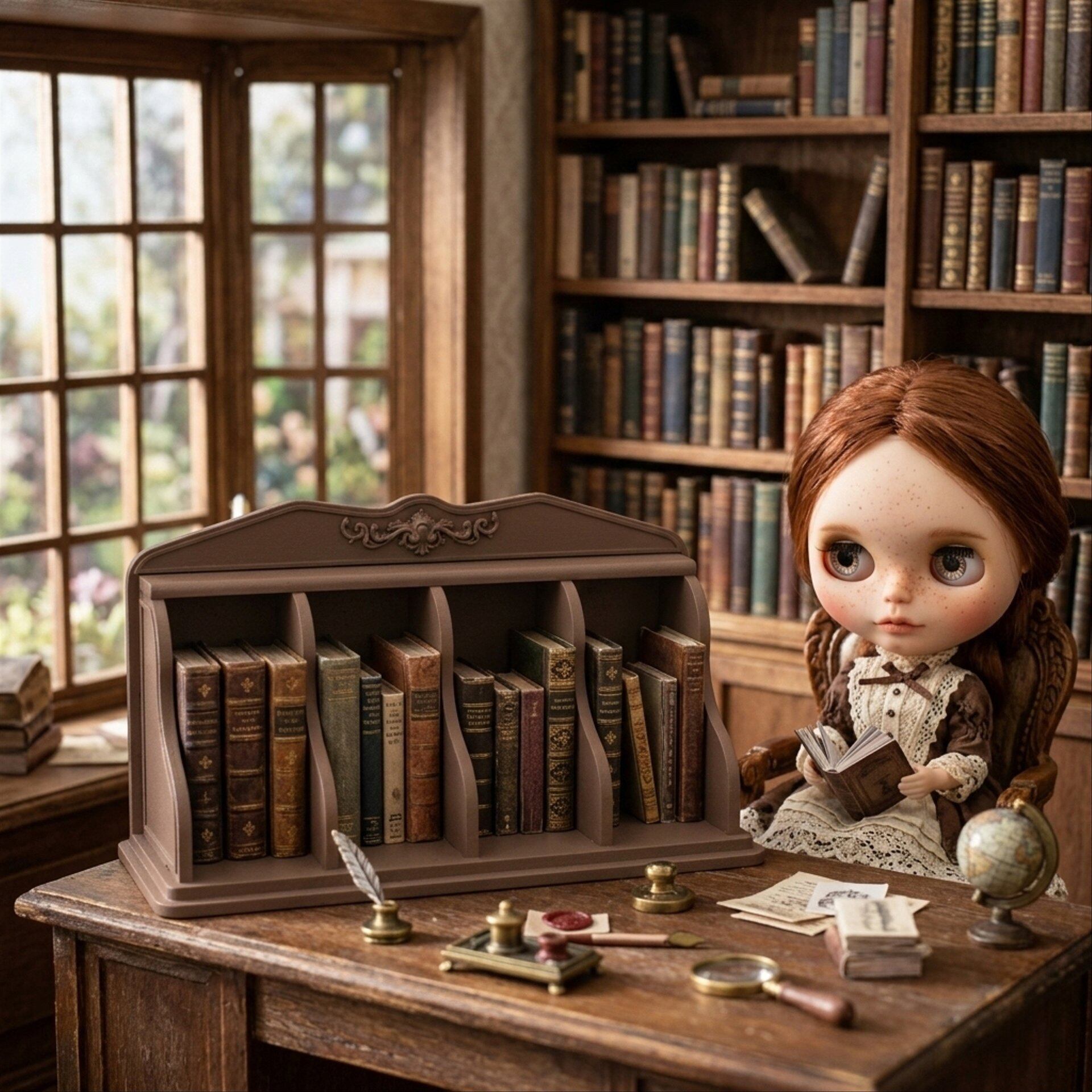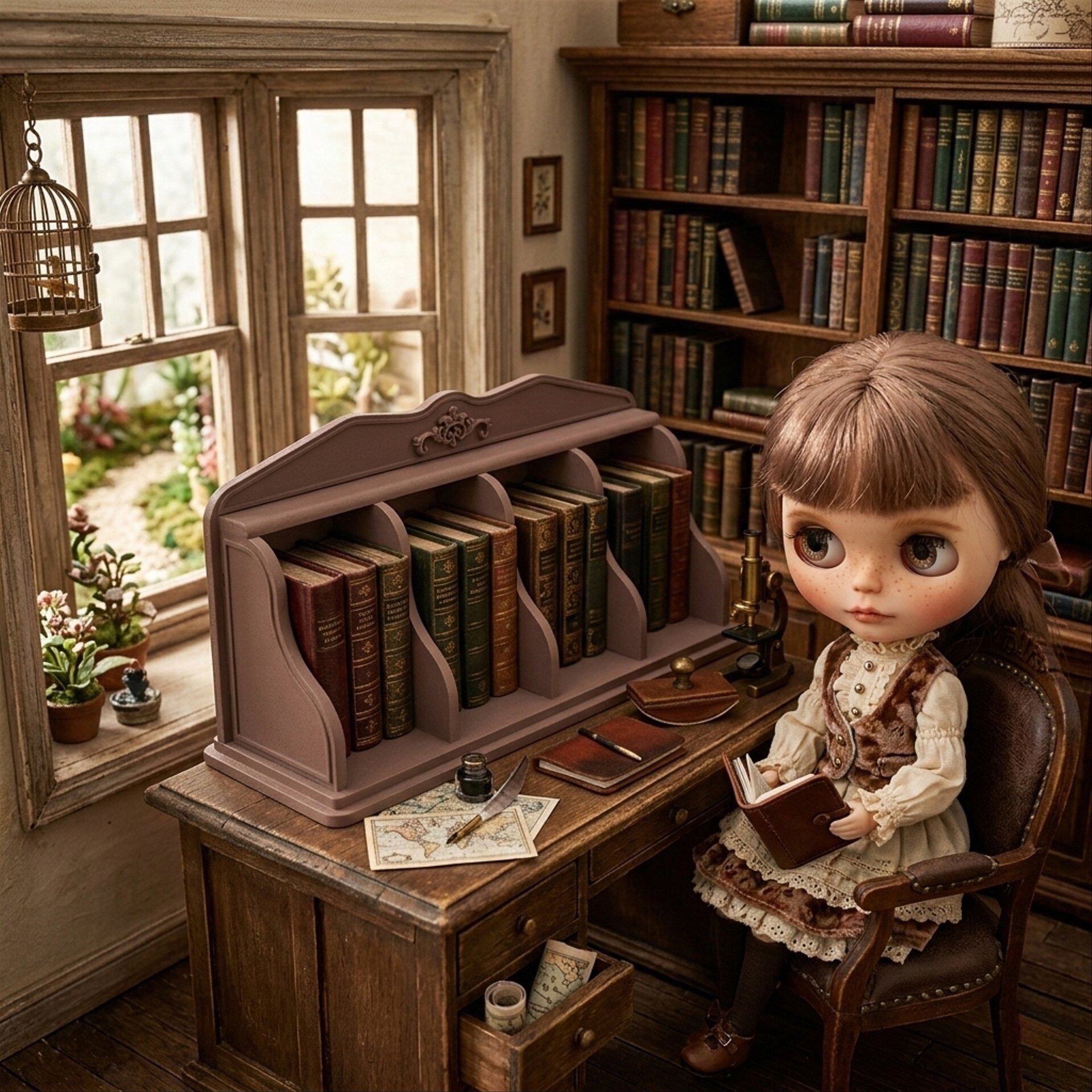 ブックスタンド 卓上本棚 ブラウン 茶 1/6 ドールハウス ミニチュア 豆本 小物入れ 飾り ミニチュア ハンドメイド アンティーク 家具 ドール dollhouse miniature