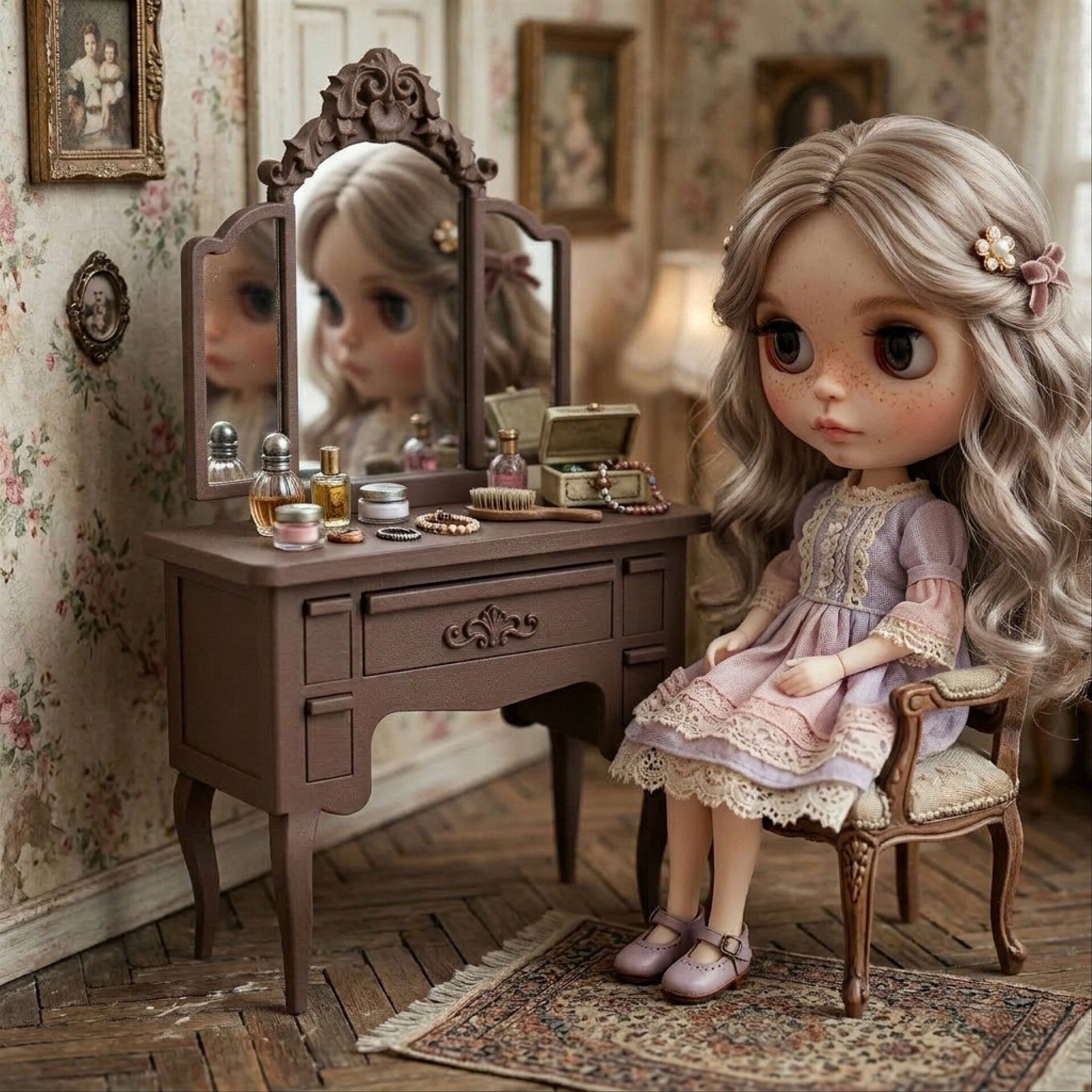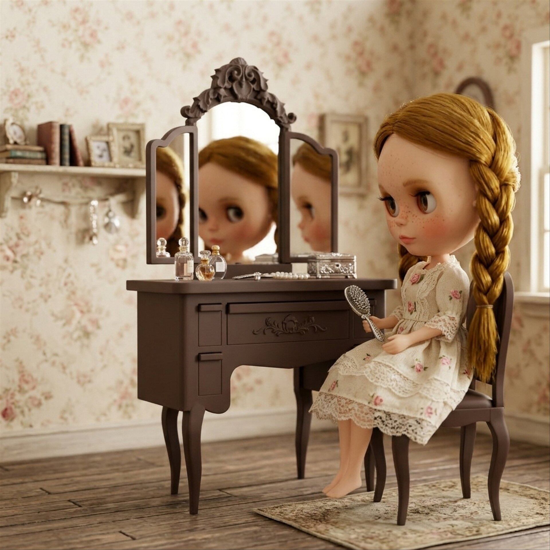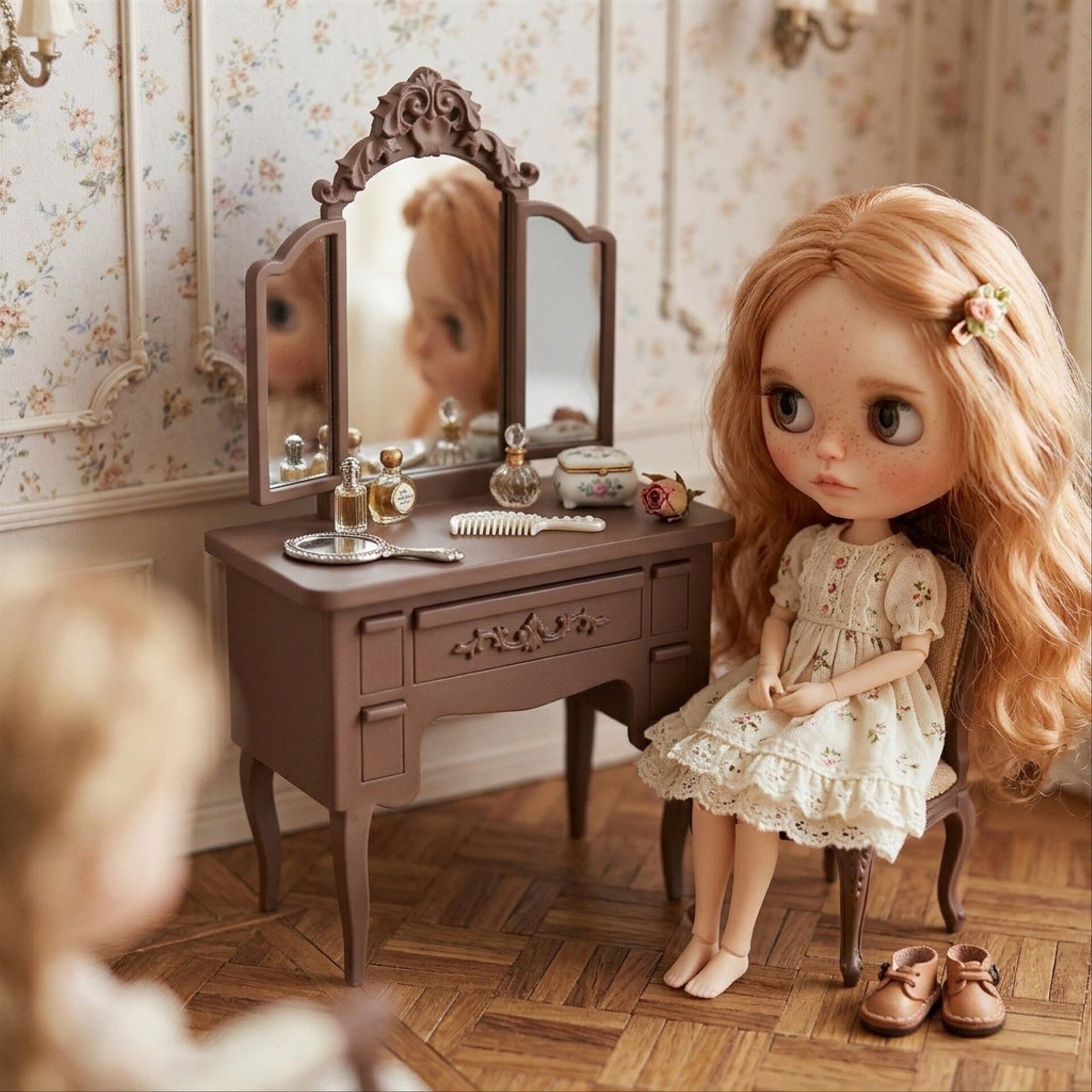 3面鏡 ドレッサー ブラウン 家具 ホワイト 1/6 ドールハウス ミニチュア