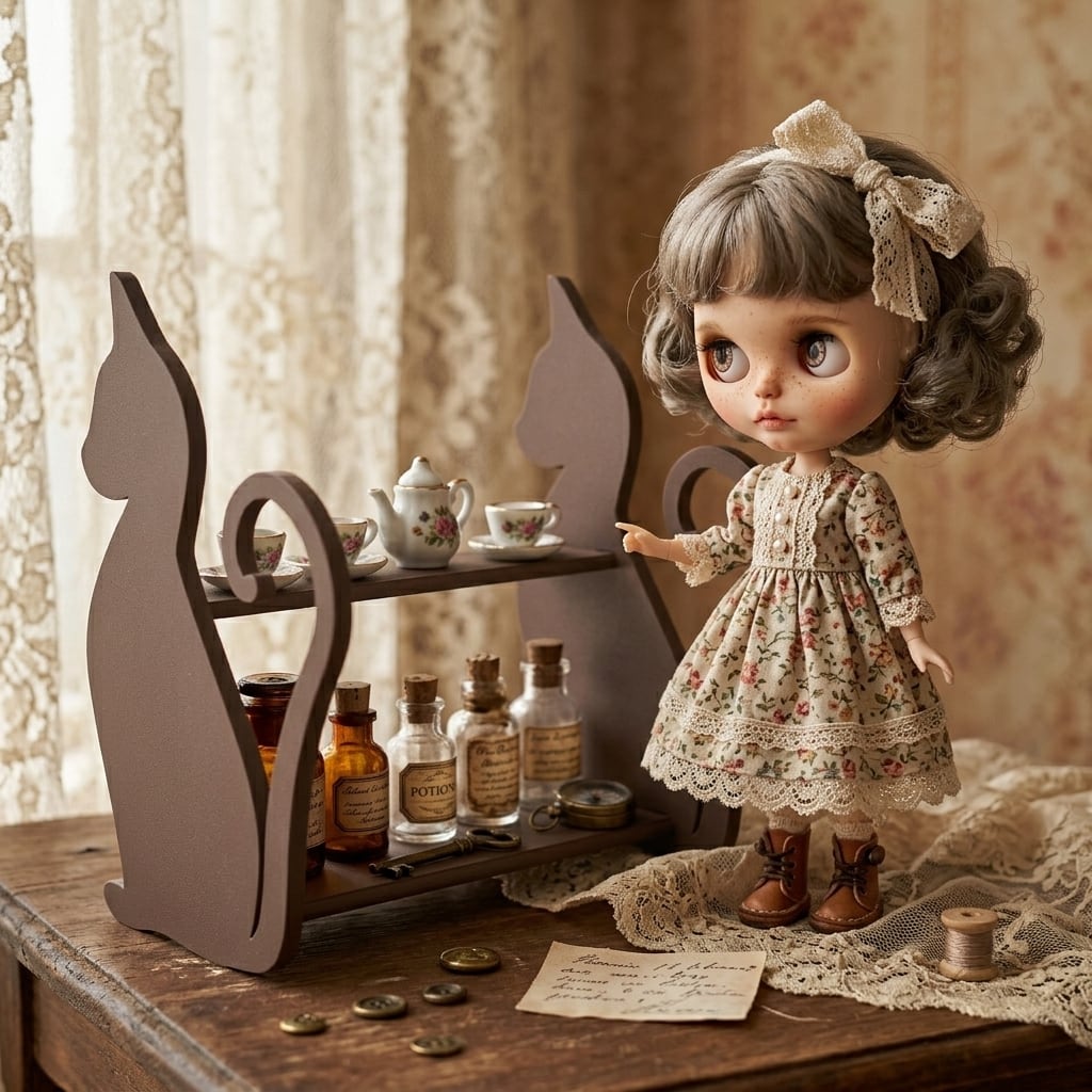キャットシェルフ① ネコ 猫 キャット cat ラック 棚 飾り棚 ブラウン 1/6 ドールハウス ミニチュア 日本製 アンティーク 家具 ドール 人形 雑貨 miniature dollhouse